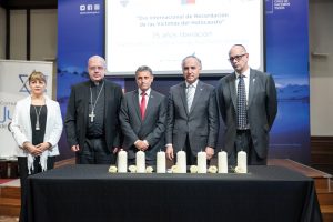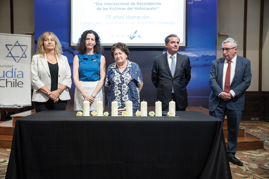 Convocado por la Comunidad Judía, B’nai B’rith y el Ministerio de Relaciones Exteriores, y la participación de la Fundación Memoria Viva y el Museo Interactivo Judío, se realizó ayer al mediodía en el Salon O’higgins del Minrel en Santiago el acto de Recordación de las Víctimas del Holocausto. La ceremonia presidida por el Canciller Teodoro Ribera, contó con la presencia de los Presidentes de las instituciones convocantes Gerardo Gorodischer y Jame Fuchs, embajadores, parlamentarios y representantes de confesiones religiosos y rabinos, y sobrevivientes de la Shoá.