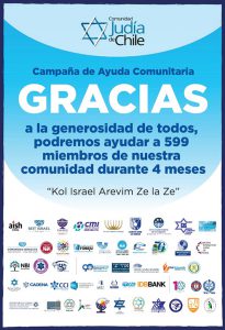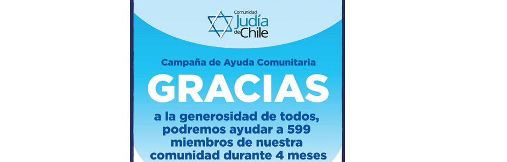 Como Comunidad Judía de Chile junto a todas nuestras Instituciones, queremos agradecer muy sinceramente a las más de mil personas que pusieron su mano en el corazón y donaron para la campaña “Hoy es Tiempo de Ayudarnos entre Todos”, gracias a todos y cada uno de ustedes es que podremos ayudar, por cuatro meses, a 599 personas de nuestra colectividad.