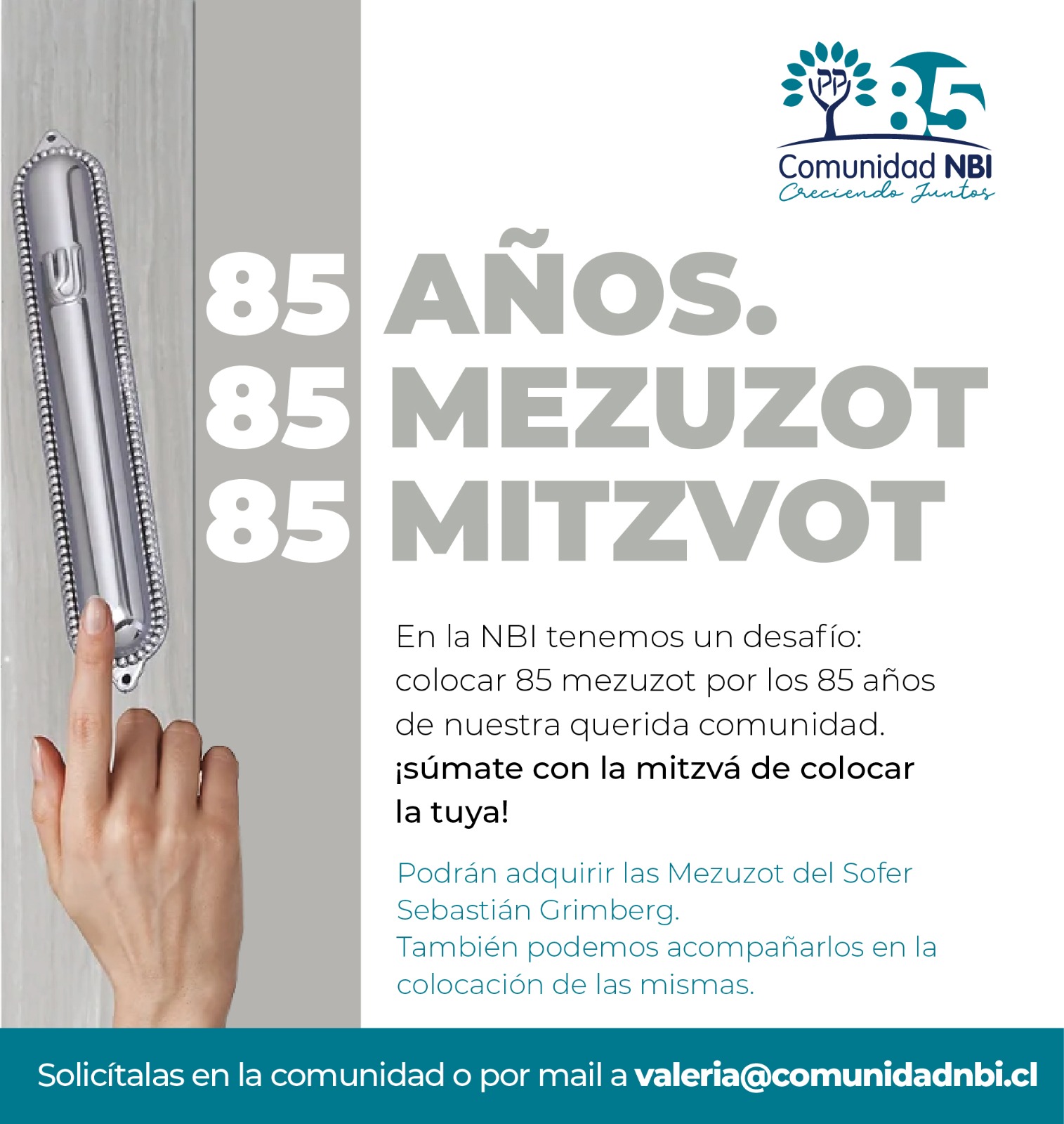 - “85 años, 85 Mezuzot”. Simbolizando nuestra conexión continua con la tradición y la protección divina, debemos llevar las palabras de la Torá en nuestros corazones, en nuestras mentes, en nuestras acciones y en nuestros hogares. La Mezuzá es un símbolo especial que se compone de un Claf, que es un pergamino escrito a mano por el Sofer Rabino Sebastián Grimberg; y un Bait, la caja exterior, simbólicamente el hogar de la Mezuzá.