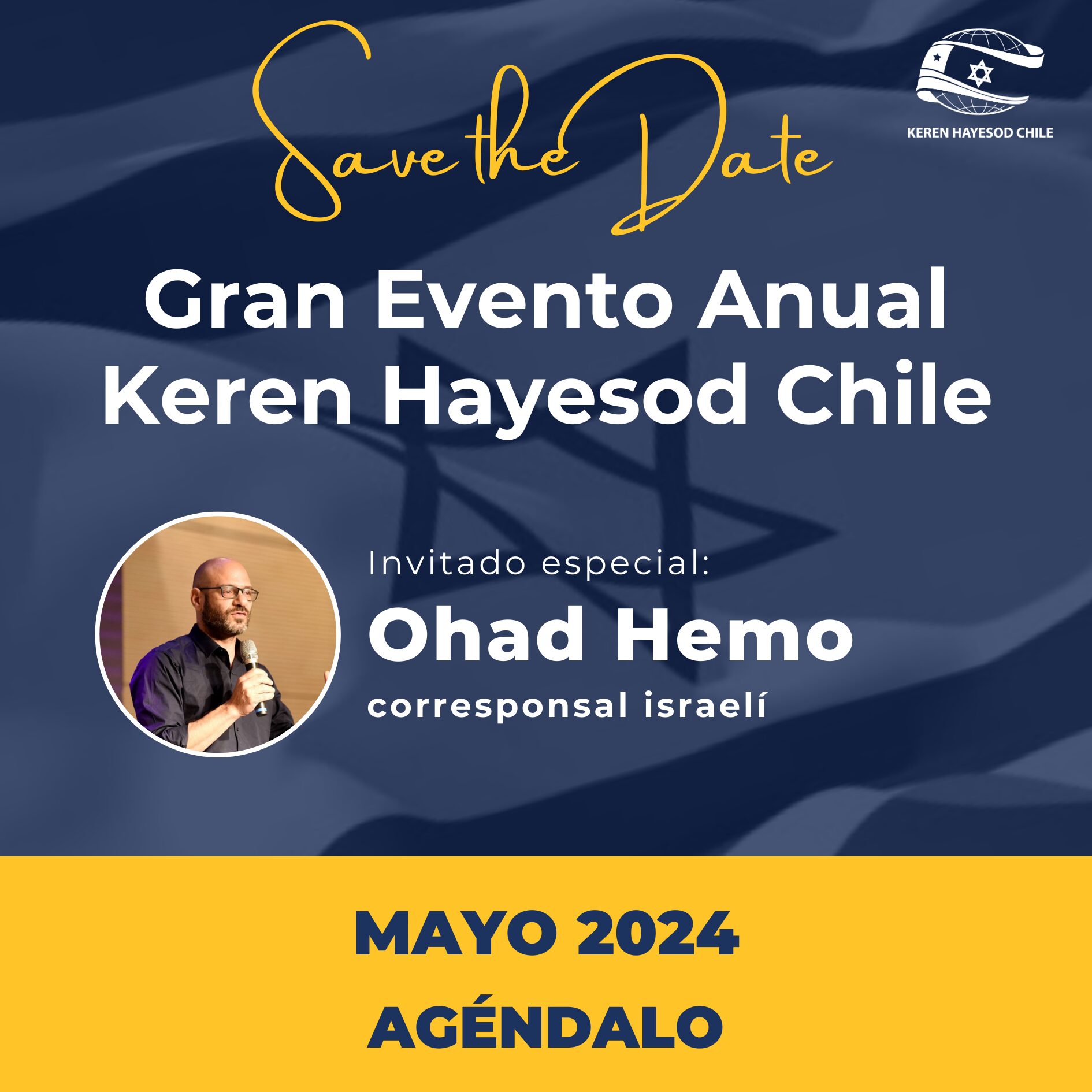 Keren Hayesod de manera anual, realiza un evento abierto, para toda la comunidad. En esta oportunidad el evento se realizará en mayo y contaremos con la presencia del Directorio de Keren Hayesod Chile, nuestro Sheliaj Roberto Avram, líderes y contribuyentes de la Comunidad Judía y además contaremos con la visita de un invitado especial desde Israel, el reconocido periodista Ohad Hemo.
