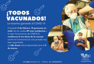 También nuestros funcionarios agradecieron y participaron de manera activa en el proceso de vacunación. Todos los que estaban presentes en la jornada recibieron la primera dosis y muchos llegaron desde sus casas a vacunarse a CISROCO, lo que da cuenta del compromiso con su propia salud, pero también del cuidado y responsabilidad con a los residentes como con a la institución.