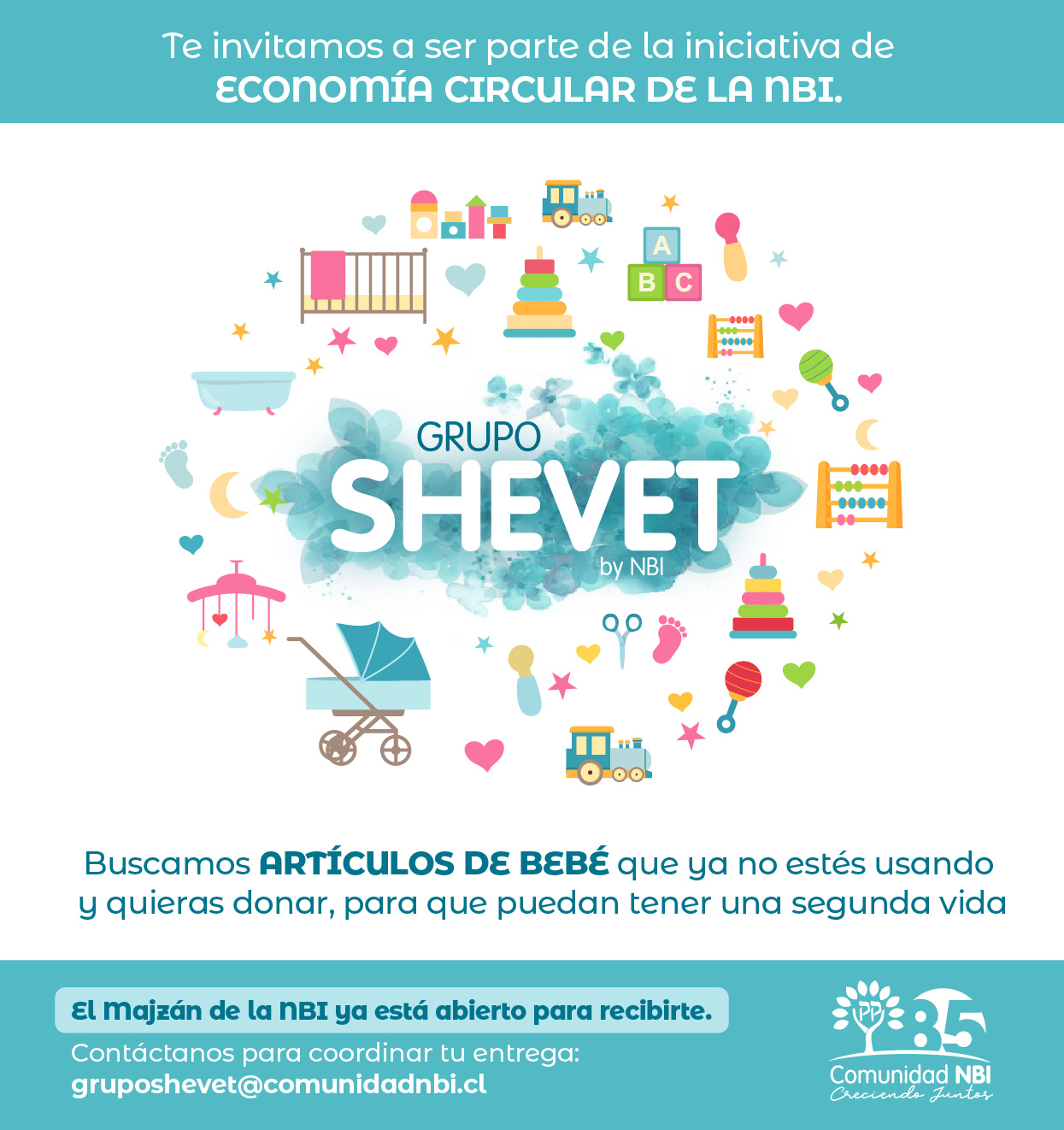 Si tienes artículos de bebé/niños que ya no uses, y estén en excelente estado (por el momento no estamos recibiendo ropa ni juguetes); si tienes disfraces que ya le quedan chicos a tus hijos o nietos; o si tienes ganas de participar y aportar a nuestro voluntariado, te invitamos a contactarnos a gruposhevet@comunidadnbi.cl