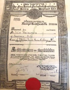 Con ocasión de la autoría de mi tercer libro “Vientos de Li-bertad” (Los Weinstein en Chile) visité a mi tía Marta Weinstein con el objeto de hacerle una entrevista para incluirla entre los más destacados parientes que conforman la familia de cerca de 1.100 nacidos en Chile, todos desde que en 1898 llegó a Chile don Salomón Weinstein, su cónyuge y tres hijos. Al finalizar nuestra reunión en su acogedor departamento de la comuna de Providencia, en un otoño lluvioso, le pido algunas fotografías para ilustrar la entrevista, y ella me conduce a una sala donde exhibe con orgullo una reliquia familiar. Era un recibo del Keren Hayesod, fechado en 1924, que acreditaba la donación de 57.11, 4 libras esterlinas -gran dinero para la época- efectuada por mi abuelo, Julio Weinstein, para ayudar a judíos que atravesando una difícil situación económica se estaban instalando recién en el país. No sé si mi tía habrá advertido ese día la conmoción que me provocó el gesto de mi abuelo que me sacó lágrimas, al valorar en toda su dimensión su nobleza humanitaria.