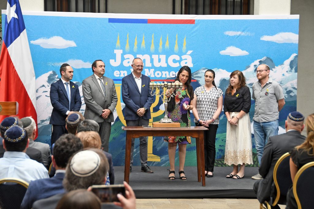 El viernes 15 de diciembre, la celebración de la Janucá en La Moneda estuvo encabezada por los ministros Álvaro Elizalde (Segpres) y Alberto Van Klaveren(Relaciones Exteriores), el capellán judío de La Moneda, rabino Eduardo Waingortin, y la presidenta de la Comunidad Judía de Chile, Ariela Agosin, que llevaba puesto un vestido que tenía bordados los nombres de los secuestrados por los terroristas