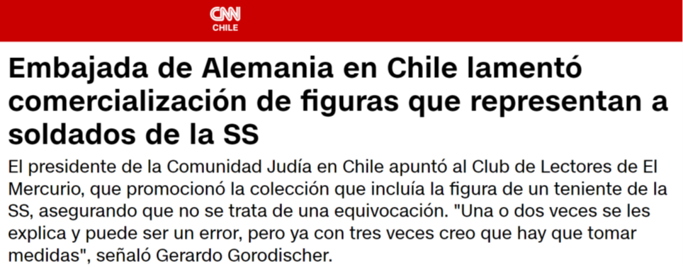 El 17 de julio se realizó el Foro de Combate al Antisemitismo, organizado por el Congreso Judío Latinoamericano. Allí la publicación de LUN fue tema de conversación obligada. Al día siguiente el lunes 18 de julio, mientras se conmemoraba un nuevo aniversario del atentado a la AMIA , en Chile presenciamos como El Mercurio, a través de su Club de Lectores, volvía a ofrecer una colección de soldados de la Segunda Guerra Mundial que incluía a un oficial de las SS. Cabe señalar que ya había ocurrido en 2019.