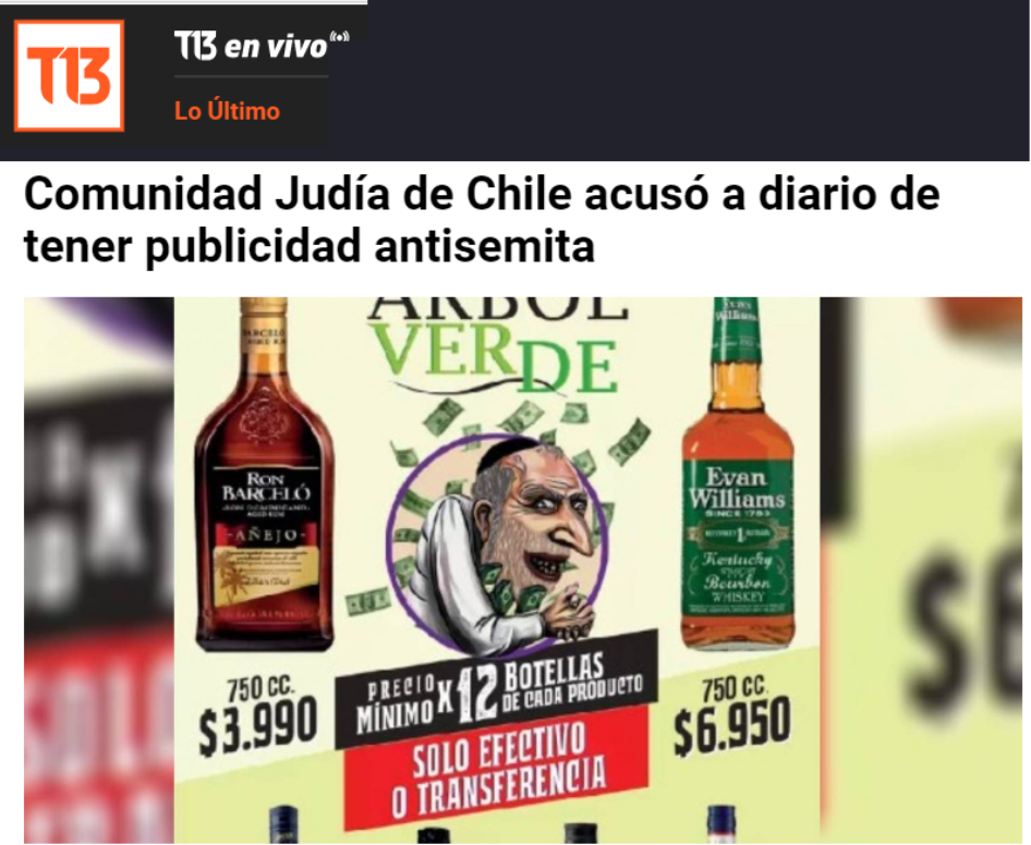 El 11 de julio, Las Últimas Noticias (LUN), publicaba un aviso de alcoholes, aludiendo al clásico estereotipo del judío avaro de la propaganda nazi. Ante la denuncia de la Comunidad Judía de Chile, sobre el uso de esta imagen, que recuerda lo peor del antisemitismo, buscamos respaldo para hacer ver que esta situación no solo era grave para los judíos, sino para todo Chile. Es así que medios como Bio Bio y T13, salieron a criticar a LUN, pero también lo hicieron instituciones internacionales como Anti Defamation League, Centro Simón Wiesenthal, Comisionado contra el Antisemitismo de la Organización de Estados Americanos (OEA) y Museo del Holocausto en Israel, Yad Vashem, entre otros.