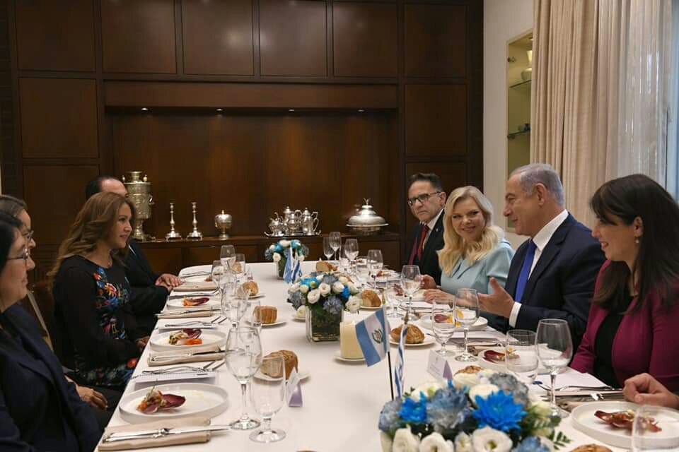 Netanyahu y su esposa fueron anfitriones de la esposa del presidente de Guatemala y su séquito en la residencia del Primer Ministro en Jerusalén. También participaron la viceministra de Relaciones Exteriores Tzipi Hotovely, el secretario del Gabinete Tzahi Braverman, el viceministro de Relaciones Exteriores para América Latina Modi Efraim y el embajador de Guatemala en Israel, Mario Bucaro.