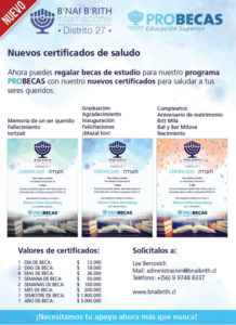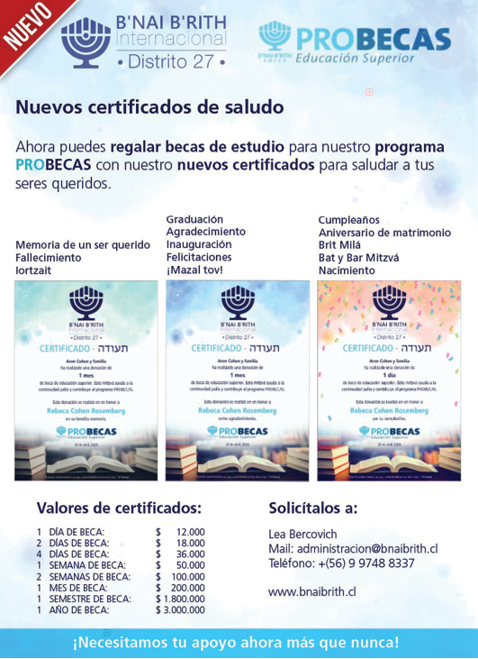 ¿Cómo ayudarnos? Te invitamos a realizar una donación a nuestro programa durante todo el año por medio de nuestra página web, www.bnaibrith.cl/probecas. También puedes regalar certificados de beca en ocasiones especiales. Lo más importante, es que nos ayudes a difundir la importante labor que realiza nuestra institución entre quienes creas lo puedan necesitar.