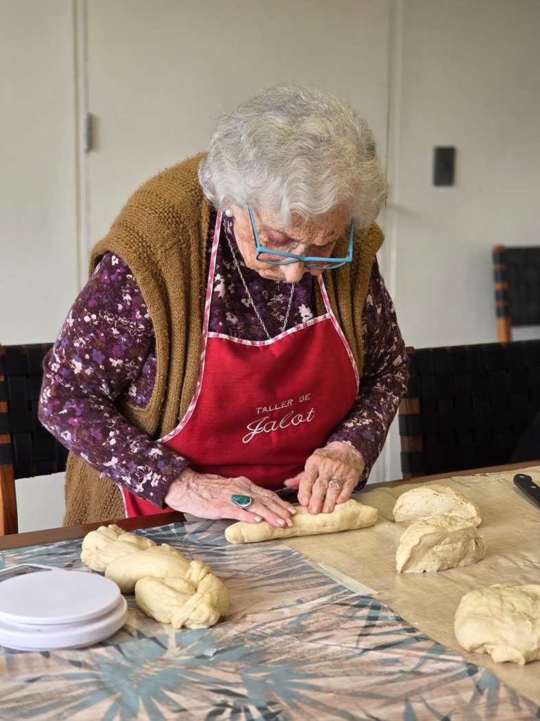 Finalmente, Berta de Vega tiene un rol clave en la preparación de la ceremonia de Shabat. Cada viernes por la mañana participa en el taller de jalá, donde realiza la oración que da inicio al trenzado del pan y elabora las jalot que serán utilizadas por la comunidad. Por la tarde, se anticipa para revisar que el espacio esté dispuesto correctamente, se encarga del jugo de uva y de que todo llegue a tiempo, y colabora activamente con el jazán Fernando durante la ceremonia. Su dedicación, respeto por la tradición y profundo sentido de comunidad hacen que cada Shabat sea una experiencia verdaderamente significativa para todos.