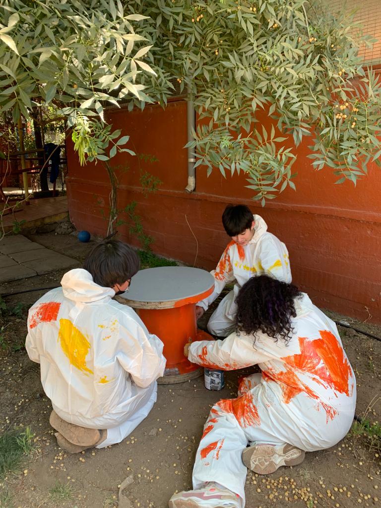 En la quinta y última sesión, los jóvenes pintaron con colores alegres los asientos reciclados que se colocaron en el área, siendo estos carretes de cables aportados y preparados por Luis Plaut (ingeniero) y sus colaboradores, quien es esposo de la directora de WIZO-CEFI, Yvonne Friedmann.