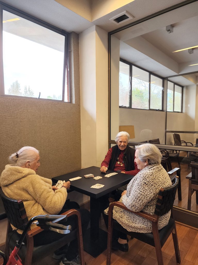 El momento después del té, se disfruta mucho jugando cartas. Es un momento especialmente grato; recordamos anécdotas de nuestra niñez o juventud, y el juego se convierte en una verdadera terapia, ayuda a nuestra memoria y al mismo tiempo compartimos también alegrías y pesares. Nunca lo planificamos, pero el juego de cartas se convirtió en una rutina diaria. La campeona es una de las mujeres más simpáticas, además de una inteligencia superior, está siempre alegre y nos hace reír con sus anécdotas. Es la única que al parecer, no tiene ningún problema, posee una mente lúcida a los 96 años.