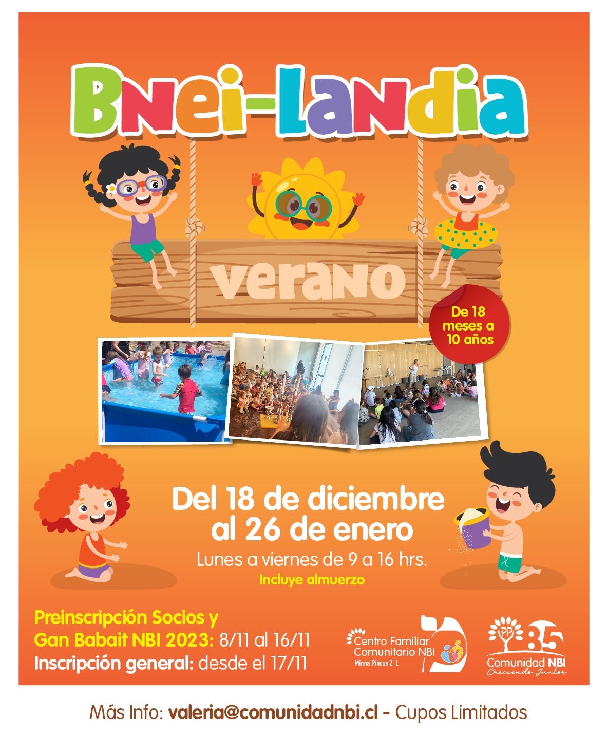 La propuesta de Bneilandia consiste en actividades durante el período de vacaciones de invierno y verano, las cuales son de lunes a viernes desde las 09:00 a las 16:00 horas. Con actividades educativas y lúdicas, las cuales se llevan a cabo en los diferentes grupos de niños. Durante la jornada, contamos con actividades dirigidas, horarios de colación y almuerzo, actividades externas (cuentacuentos, rikudim, cocina, etc.), actividades judaicas como Shabat, Jánuca, Tu Bishvat y otras, y también espacios con los padres, especialmente para el cierre de las temporadas.