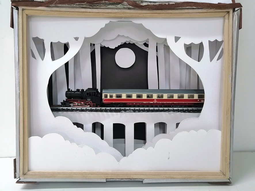Para realizar su proyecto, la talmidá usó una caja de cartón, goma eva, cartulina blanca, pintura plateada, un tren y rieles marklin. Pintó la caja, utilizó las cartulinas e hizo relieves. Para que tuviera un look más original, transformó la parte de afuera de la caja en una maleta.