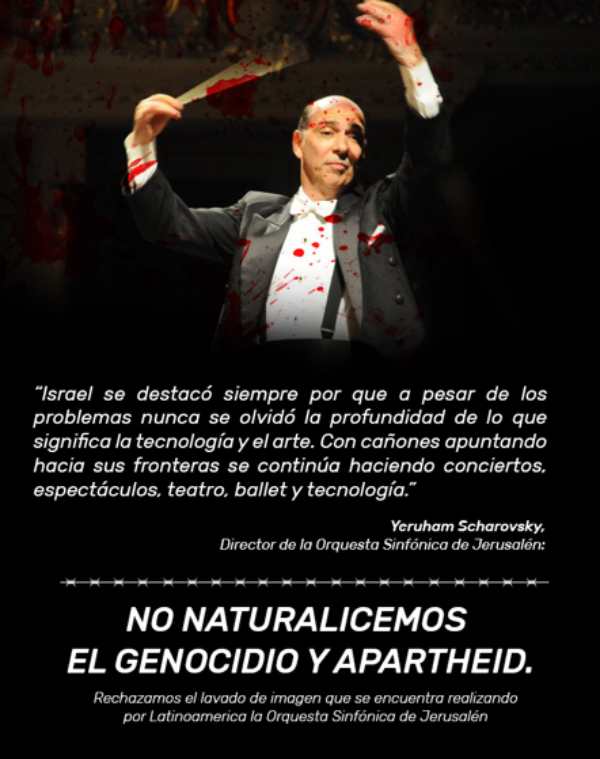 Con el objetivo promover el BDS y de acusar a Israel de genocidio y de ser un estado apartheid, fue difundida una imagen en la que se aprecia al director de la Orquesta de Jerusalén, Yeruham Scharovsky, bañado en sangre. De esta forma se pretende demostrar que el Estado de Israel ocultaría sus supuestos crímenes a través del avance en la tecnología y la difusión de la cultura.